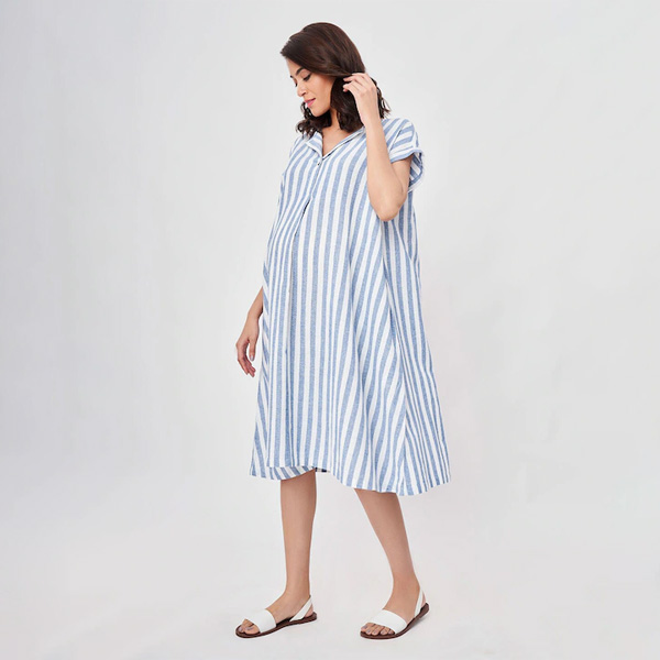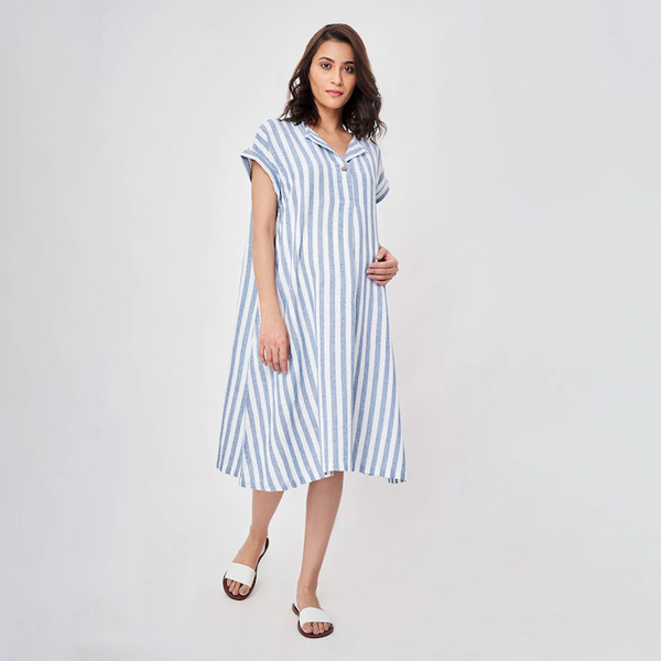 Blue Striped Maternity Shirt Midi Dress