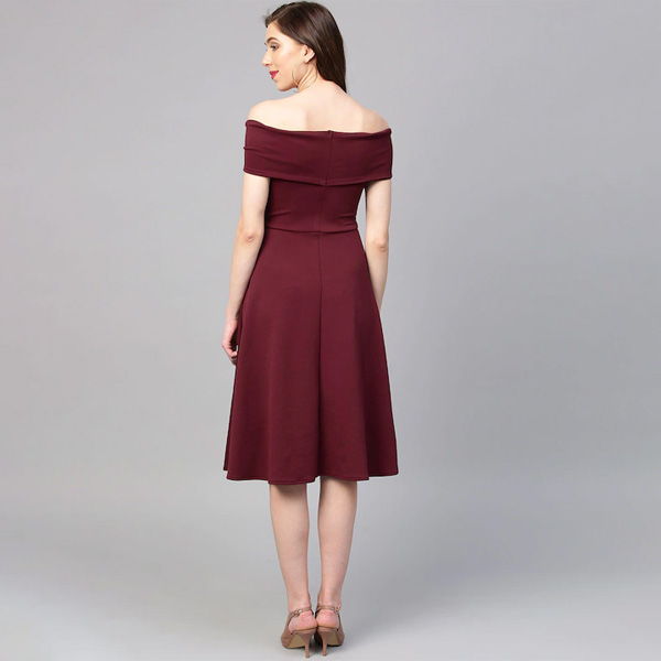 Burgundy Off-Shoulder Pleated Fit & Flare Dress