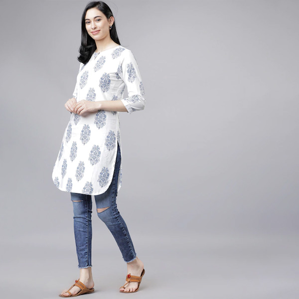 White and blue printed tunic, has a round neck, three-quarter sleeves, curved hem