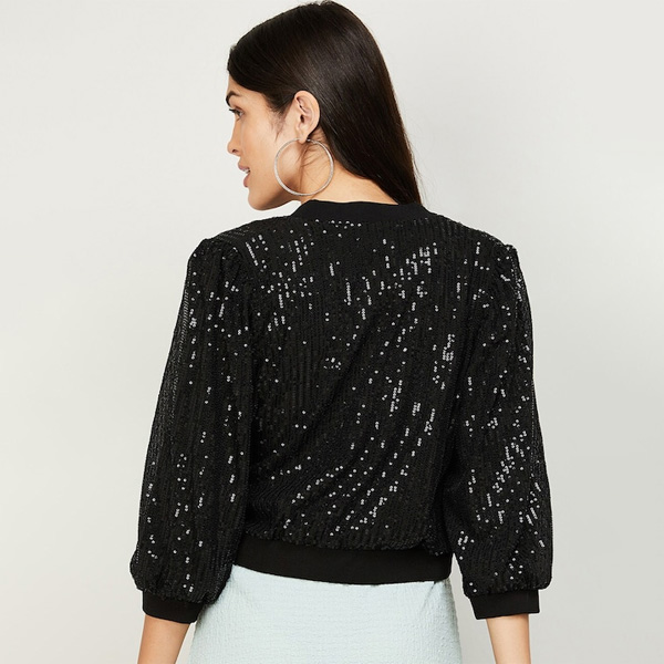 Black self design open front crop shrug ,has three-quarter sleeves, embellished detail, straight hem
